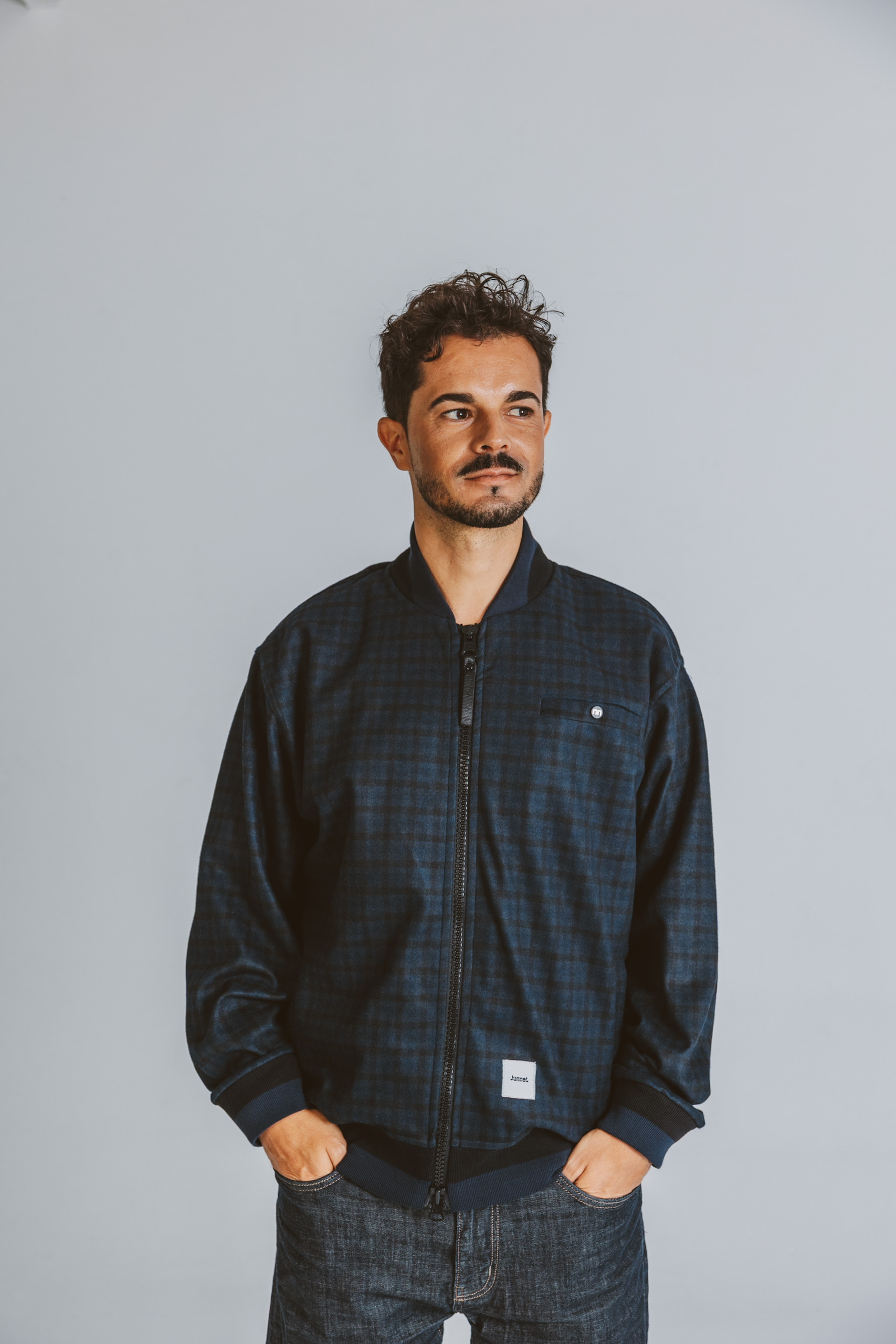 Refined jacket made of technical fabric and printed in an elegant and modern tattersall in blue and black tones. Long sleeves and bomber style collar with two-tone rib. Sporty and perfect to go to the office or to enjoy an outing with friends. Finished with double slider zipper. Front welt pockets and Junnet logo. Sustainable production as it is limited to a maximum of 40 units. 100% sustainable fashion Barcelona.